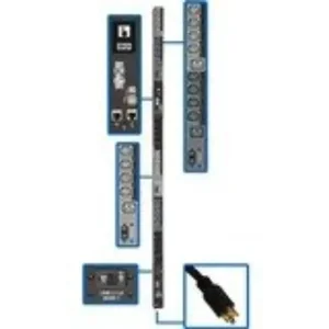 The PDU3EVSR6L2130 10kW 3-Phase Switched Power Distribution Unit provides advanced network control and remote power monitoring with the ability to turn on, turn off, reboot or lock out power to each outlet. Recommended for any IT or industrial application, it features 30 switched outlets (24 C13 and 6 C19) with included plug-lock insert sleeves to prevent cables from becoming accidentally disconnected. A six-foot cord with NEMA L21-30P plug connects the PDU to a compatible AC power source, generator or protected UPS. The built-in Java-free HTML5-based LX Platform network interface enables full remote access for PDU status monitoring and email notifications via secure web browser, SNMP, telnet or SSH. It supports 10/100 Mbps auto-sensing for optimum communication with an Ethernet network. Optional EnviroSense2 modules (sold separately) provide a variety of environmental monitoring capabilities. Protocols supported include HTTP, HTTPS, SMTP, SNMPv1, SNMPv2, SNMPv3, telnet, SSH, FTP, DHCP and NTP. A color touchscreen LCD lets you toggle between menus to monitor input and output current levels, as well as environmental sensor data and network information. It also generates a unique QR code to allow access to the switchable PDU through a mobile device. The 0U PDU mounts vertically in racks using the included toolless mounting buttons or the included rack-mounting brackets. Use the included PDUMVROTATEBRKT kit to install the unit with outlets facing the rear for better airflow or equipment access.Technical InformationPDU Type: SwitchedPhase: Three PhaseInput Receptacles: NEMA L21-30POutput Receptacles: 6 x IEC 60320 C19, 24 x IEC 60320 C13Protection Type: Overload ProtectionPower DescriptionInput Voltage: 230 V ACOutput Voltage: 200 V AC, 208 V AC, 240 V ACPower Rating (Watt): 10 kWInput Current: 24 AManagementManagement: Protocols: HTTP HTTPS SMTP SNMPv1 SNMPv2 SNMPv3 telnet SSH FTP DHCP NTP Physical CharacteristicsMounting Orientation: VerticalPlacement: RackForm Factor: Rack-mountableRack Height: 0UHeight: 70"Width: 2.2"Depth: 2.9"Weight (Approximate): 16.55 lbMiscellaneousPackage Contents: PDU3EVSR6L2130 30-Outlet PDU Built-in LX Platform Interface Configuration Cable 30 x Plug-lock Insert Sleeves Rack-mounting Hardware Mounting Bracket Accessory Owner's Manual Environmentally Friendly: YesEnvironmental Certification: RoHSTAA Compliant: YesWarrantyLimited Warranty: 2 Year