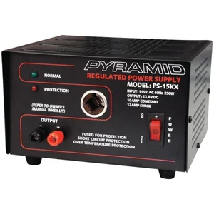 Pyramid Model: PS15K 10 Amp Hobbyist Bench Power Supply, AC-to-DC Power Converter with Car/Vehicle Plug Power Outlet (10 Amp).Provides Constant Source of DC Voltage. Simple Electronic Plug-in Operation. Hassle-Free Screw Terminal Connectors. Eliminates the Need of Battery or External Power Source12V Car/Vehicle Cigarette Lighter Power Accessory Outlet Connector. Fuse Protected with Auto-Reset. Electronic Overload & Short Circuit Protection. Amperage: 10.0 AMP (Constant), 12.0 AMP (Surge)Connectors/Hardwire Terminals: Red Positive (+), Black Negative (-)Power Output: 13.8V DCPower Input: 115V AC, 60Hz (250 Watt)Dimensions (L x W x H): 7.9'' x 7.2'' x 4.7''. The Pyramid Power Supply provides convenient and reliable AC-to-DC power performance. Universal hardwired screw-type connection terminals are hassle-free and ensure compatibility with a wide range of device equipment & components.