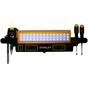 The Stanley LED work light features a 45 COB LED ultrabright light with an adjustable angle, 4 AC power outlets, 2 USB charging ports, and hand tool storage compartments on both sides.