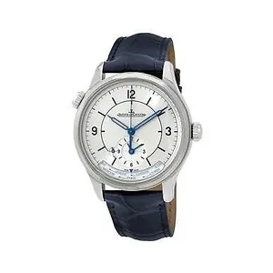 JAEGER LECOULTRE Q1428530 Master Geographic Automatic Men's Watch The Silver-tone stainless steel case with a navy blue alligator leather strap. Fixed silver-tone stainless steel bezel. Silver dial with blue skeleton hands and index hour markers. Arabic numerals mark the 3, 9 and 12 o'clock positions. minute markers around the outer rim. Dial Type: Analog. One subdial displaying: second time zone. Jaeger LeCoultre Calibre 939B/1 Automatic movement, containing 34 Jewels, bitting at 28800 vph, and has a power reserve of approximately 43 hours. Scratch resistant sapphire crystal. Transparent see through case back. Round case shape, case size: 39 mm, case thickness: 11.77 mm. Tang clasp. Water resistant at 50 meters / 165 feet. Functions: GMT, second time zone, hour, minute, second. Master Geographic Series. Luxury watch style. Watch label: Swiss Made. Jaeger LeCoultre Master Geographic Automatic Men's Watch Q1428530. Features: Brand: Jaeger LeCoultre Series: Master Geographic Gender: Men's Model: Q1428530 Watch Label: Swiss Made Movement: Automatic Case Size: 39 mm Case Shape: Round Band Material: Alligator Leather Band Type: Strap Band Color: Navy Blue Dial Color: Silver Type: Analog Crystal: Scratch Resistant Sapphire Hands: Blue Skeleton Dial Markers: Index Second Markers: Arabic Numerals mark the 3, 9 and 12 o'clock positions. Minute Markers around the outer rim Bezel: Fixed Bezel Material: Stainless Steel Water Resistance: 50 meters / 165 feet