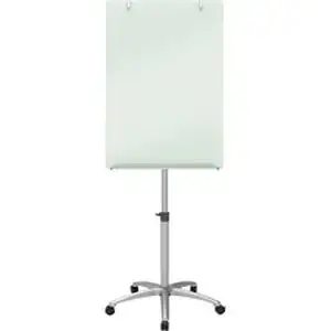 Mobile presentation easel is height-adjustable for better visibility to the entire audience. Glass surface is magnetic for dual-purpose use as a writing board and magnetic bulletin board. Durable, tempered-glass board is easy to clean. Top clamp lets you quickly attach flip charts. Smooth-rolling, five-caster base allows quick, easy mobility. Accessory tray keeps your writing utensils always within reach.