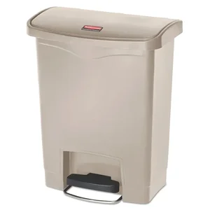 Slim Jim Step-On Container maximizes space efficiency with a small footprint and slim profile, ensuring a perfect fit in even the tightest spaces. Premium-quality plastic meets the needs of any environment with efficiency, safety and durability. Quiet and controlled lid closure minimizes noise to enhance guest and patient satisfaction. Internal hinge design prevents wall damage. Front step offers hands-free access. Increased foot pedal clearance allows easier access and operation. Container holds 8 gallons or 30 liters. Factory mutual certified container ensures fire safety for regulatory compliance. It meets OSHA and OBRA standards for worker and environmental safety. Liner retainer band easily and securely holds polyliners. Smooth surfaces and contoured edges are easy to clean.