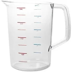 Take the guesswork out of portion control with long-lasting, colorful measurement markings on this Bouncer Measuring Cup that holds 4 quarts. One side is marked in red in ounces and divisions of a cup. The other side is marked in blue in milliliters. Break-resistant polycarbonate measuring cup is clear for fast, easy identification of contents. It can withstand temperature from negative 40 degrees Fahrenheit/40 degrees Celsius up to 212 degrees Fahrenheit/100 degrees Celsius. Convenient handle makes it easy to pour or scoop.