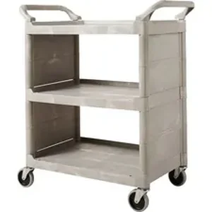 Versatile, durable utility cart performs a wide variety of tasks. High-style, compact-size works well in any academic setting. The sturdy top shelf accommodates audiovisual or technical equipment. Ergonomic handles on each end of the cart and 4" (10.2 cm) nonskid swivel casters ensure quiet, trouble-free maneuverability between rooms, in halls and through doorways. Durable, all-plastic construction is easy to clean and resists corrosion and dents. Molded-in color, smooth contours and contemporary styling keep the cart looking fresh and help enhance the image of any facility. The 300 lb. capacity accommodates a full load.