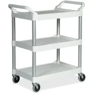 Three-shelf, utility cart is versatile for audiovisual, video, filing and foodservice purposes and offers a high-style appearance with brushed aluminum uprights. Smooth surfaces are easy to clean. Quiet casters and plastic construction help eliminate noise. Shelves feature a 1/4" lip on three sides and one flat side for easy loading. Cart holds a total of up to 200 lb. Maneuver cart easily with dual-molded handles and 4" nonmarking swivel casters.