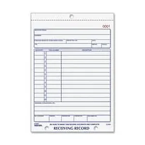Receiving Recording Book contain 50 sets of carbonless receiving forms. Forms are sequentially numbered. Include boxes for information about submitting individual or organization and about up to 12 items including quantity and description. Forms come in a manifold book with a flexible cover.