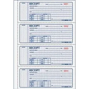 Manifold book with a flexible cover contains carbonless receipt forms that are consecutively numbered in red. Duplicates feature black print. Security screen prevents alterations on the two-part forms with originals in white and duplicates in yellow. Each page includes four forms. Each form includes a place for date, payment amount, name of payer, payer's address, item description and recipient name. A chart along the bottom breaks down the payment and includes boxes to fill in the amount of account, amount paid, balance due and payment method with preprinted boxes for cash, check and money order.