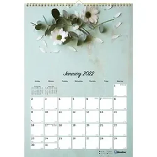 Romantic Wall Calendar will delight you with beautiful flower images and calming colors that change ever four months. In addition to the four-color floral images, each monthly sheet features daily unruled blocks for flexible planning and reminders, Sunday-through-Saturday format, numbered weeks, count of days/days remaining, moon phases, holidays and past and future months reference. Dated planning pages range 12 months from January to December. Reinforced chipboard backer provides writing support. Gold twin-wire binding with eyelet allows easy hanging. Large calendar pages are made with a high percentage of recycled fiber.