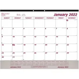 Monthly desk pad offers ample planning space to organize your entire month and look ahead for future planning. Clear vinyl strip at bottom protects the sheets from bending. Use the two holes at the top binding to hang this large calendar on your wall. Tear-off monthly sheets are bound and perforated for clean removal. Dated planning pages range 12 months from January to December. One-month-per-page format includes ruled daily blocks, Sunday-through-Saturday scheduling, count of days/days remaining, holidays, moon phases and a yearly calendar along the bottom. Nonrefillable pad also features a reinforced chipboard backer to protect your desk surface.
