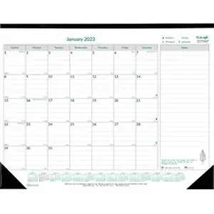 Monthly desk pad is made with a high percentage of recycled post-consumer material and features an ecological tip on each page. One-page-per-month format includes unruled daily blocks, Sunday-through-Saturday scheduling, moon phases, count of days/days remaining, holidays, an unruled notes column and a 14-month calendar reference on the bottom. Dated planning pages range 12 months from January to December and are bound at the top with a headband. The current reference month is bolded. Desk pad also offers a headband, two corners to secure pages and a reinforced chipboard back to protect your desktop.