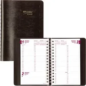 Daily planner offers 12 months of planning from January to December. One-page-per-day format offers ruled daily columns, appointment times from 7 AM to 8:45 PM in 15-minute intervals, holidays and count of days/days remaining. Past, current and two future months reference stretches across two days. Dated planner also includes twin-wire binding, a soft cover and telephone/address section. Planning pages are printed in English.