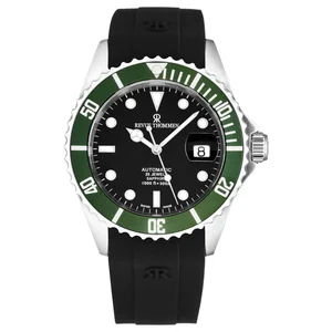 Revue Thommen 17571.2834 Men's 'Diver' Black Dial Rubber Strap Swiss Automatic Watch Revue Thommen 17571.2834 Men's 'Diver' Black Dial Rubber Strap Swiss Automatic Watch features a stainless steel 42mm case, with a uni-directional rotating bezel, a black dial and a scratch resistant sapphire crystal. The 22mm rubber band is fitted with a deployment with push button release clasp. This beautiful wristwatch, powered by Swiss Automatic movement. This watch has a water resistance of up to 1000 feet/300 meters, suitable for recreational swimming, diving and snorkeling. Features: Brand: Revue Thommen Model number: 17571.2834 Case Shape: Round Dial window material type: Sapphire Display Type: Analog Clasp: Deployment with Push Button Release Case material: Stainless steel Case diameter: 42 millimeters Case Thickness: 12.65 millimeters Band Material: Rubber Band length: 8 inches Band Width: 22 millimeters Band Color: Black Dial color: Black Bezel material: Stainless Steel Bezel function: Uni-directional Rotating Movement: Automatic Water resistant depth: 300 meters UPC: 794504462340 Revue Thommen 17571.2834 MSRP: $ 2400