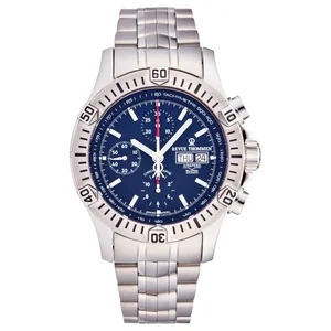 Revue Thommen 16071.6126 Men's 'Airspeed' Blue Dial Day-Date Chronograph Automatic Watch Revue Thommen 16071.6126 Men's 'Airspeed' Blue Dial Day-Date Chronograph Automatic Watch features a stainless steel 45mm case, a blue dial, and a sapphire crystal. The 22mm stainless steel band is fitted with a fold over with safety release clasp. This wrist watch is powered by ETA-Valjoux Caliber 7750 automatic movement. This watch has a water resistance of up to 330 feet/100 meters, suitable for short periods of recreational swimming. Features: Brand: Revue Thommen Model number: 16071.6126 Case Shape: Round Dial window material type: Sapphire Display Type: Analog Clasp: Fold Over with Safety Release Case Material: Stainless Steel Case diameter: 45 millimeters Case Thickness: 15 millimeters Band Material: Stainless Steel Band length: 8 inches Band width: 22 millimeters Band Color: Silver-tone Dial Color: Blue Bezel Material: Stainless Steel Bezel Function: Uni-Directional Movement: Automatic Special Features: Chronograph Water-resistant depth: 100 meters UPC: Revue Thommen 16071.6126 MSRP: $ 3,700