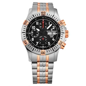 Revue Thommen 16071.6154 Men's 'Air speed' Black Dial Chronograph Day-Date Two-Tone Swiss Automatic Watch Revue Thommen 16071.6154 Men's 'Air speed' Black Dial Chronograph Day-Date Two-Tone Swiss Automatic Watch features a stainless steel 43.5mm case, a black dial, and a sapphire crystal. The 22mm stainless steel band is fitted with a fold over with safety release clasp. This wrist watch is powered by ETA-Valjoux Caliber 7750 automatic movement. This watch has a water resistance of up to 330 feet/100 meters, suitable for short periods of recreational swimming. Features: Brand: Revue Thommen Model number: 16071.6154 Case Shape: Round Dial window material type: Sapphire Display Type: Analog Clasp: Fold Over with Safety Release Case Material: Stainless Steel Case diameter: 43.5 millimeters Case Thickness: 16 millimeters Band Material: Stainless Steel Band length: 8 inches Band width: 22 millimeters Band Color: Silver-tone and Rose Gold-tone Dial Color: Black Bezel Material: Stainless Steel Bezel Function: Fixed Movement: Automatic Special Features: Chronograph Water-resistant depth: 100 meters UPC: Revue Thommen 16071.6154 MSRP: $ 3,900
