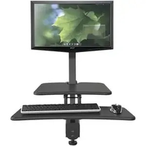 The Up-Rite Desk Mounted Sit/Stand Workstation instantly transforms your existing desk into an ergonomic work space, allowing you to sit or stand as you work. Sitting for six to eight hours a day isn't ideal, and standing all day can be hard on you as well. By easily alternating your positions, you'll enjoy higher productivity, better posture and have fewer energy dips. This TAA-compliant workstation easily attaches to your existing desk (up to 1-1/2" thick) for 18" of pneumatic height adjustability. Simply disengage the locking mechanism and adjust to your desired height. Monitor mounts adjust 21" along the main tube for even more positioning options. Workstation also includes a retractable, keyboard/mouse tray (27" wide x 9-63/100" deep) and an additional shelf (19-3/4" wide x 12" deep) for a tablet. It is VESA compatible mount from 75mm to 100mm. Weight capacity is up to 15 lb. Center to center maximum is 25". The included 60" of cable management keep your cords under control.