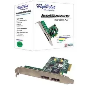 The RocketRAID eSATA For Mac is a PCI-e add-in card with 2 independent 3Gb/s eSATA connectors. It is ideal for those who need fast, efficient and reliable storage for their Mac Pro systems. It supports booting on Intel based Mac Pro systems. HighPoints RAID 0, 1,_,JBOD technology provides data security and performance. The dual]Gb/s eSATA ports combined with HighPoints RAID technology provide the high-level of performance required to support multi-stream HDV, DVCPro HD, XDCAM HD, ProRes 422 and uncompressed SD workflows. -------------------------