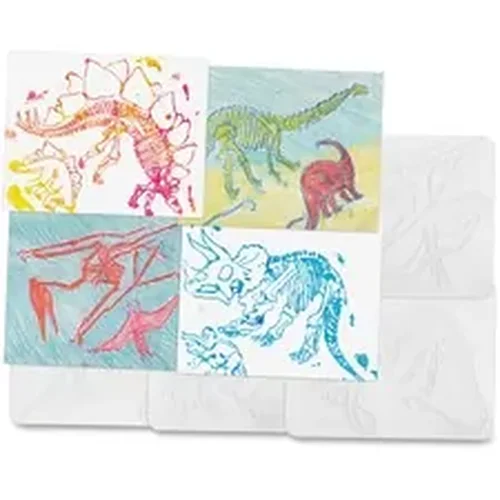 Dinosaur Rubbing Plates are versatile and fun for art, design, science, geography and much more. This hands-on, easy-to-use tool is sure to enhance learning concepts. As children study different dinosaurs and their skeletal outlines, they can express what they've learned. Add texture to artwork by placing paper over a plate and rubbing with a crayon, marker or pencil to make the design emerge. Layer designs for more effects. Fill with or press into modeling clay. Sturdy plastic rubbing plates work great with paper mache. Make sun catchers using white glue and food coloring. Simply fill tray and let dry. Peel the resulting mold off, and you're done. Each set includes six rubbing plates and a guide with craft ideas. They are recommended for children ages 3 and over.