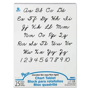Chart tablet features each uppercase and lowercase letter of the alphabet written in manuscript as well as numbers 1 through 10. Students can practice writing using these examples on the white, sulphite bond paper that is 1-1/2" ruled on both sides. Ruling also includes 3/4" broken midline and 1/2" skip space. Spiral-bound, stiff cover provides sturdy support. Recyclable tablet is two-hole punched.