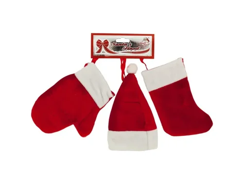 Add a touch of holiday cheer to your home with this delightful hanging decoration set. Featuring a mini red and white velvety stocking, coordinating hat, and mitten, each piece comes equipped with a red ribbon loop for easy hanging. Perfect for adorning your tree, front door, or anywhere you want to spread seasonal joy!