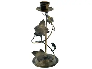Add an elegant touch to your home decor with the Elegant Metal Spiral Vine Candle Holder. This unique piece showcases a climbing ivy vine design on a sturdy stem, complemented by a round base finished in antique brass.