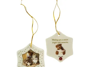 Add a delightful touch to your Christmas tree with the Charming Holiday Bears Porcelain Ornaments Set. This beautiful 2-piece set features hexagon-shaped ornaments made of glazed white ceramic, adorned with enchanting photos of teddy bear angels set against shimmering gold star backgrounds.
