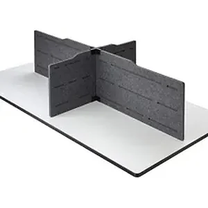 These stand-alone privacy panels are a great option to create quick and easy space division on table or desktops in open work areas. The stand-alone feature allows them to be used on any worksurface to separate space, with no need for a tabletop edge to clamp on to for added versatility. Durable steel connectors have a black powder-coat finish for long-lasting strength. Panels are made of PET fiberboard to provide not only visual but also audible privacy. With two panel widths, these privacy panels can be reconfigured in a multitude of ways to suit individual needs and spaces. This Plus Personal Privacy Panel Kit includes two 36" wide panels, two 18" wide panels and two Plus-connectors. Panels are great for use in classrooms, libraries, shared work spaces, open offices and more. to create smaller private work spaces or touchdown points. They pair well with the Safco Accessory Kit (model 1942W).