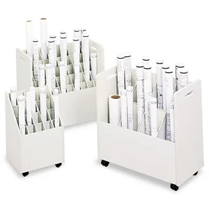 Store and organize your documents with this compact mobile roll file - a perfect fit for projects on-the-go. Keep your projects organized and in one place and then simply roll them on the 2" swivel carpet casters from your office to your conference room with no problem. Grand stand design and 50 square tubes for trouble-free removal make organization easy for work in progress. Each compartment measures 2-3/4" wide x 2-3/4" deep. Sturdy, furniture-grade particleboard with a textured vinyl laminate finish holds up to 50 lb. evenly distributed. Mobile roll file assembly quickly and easily.