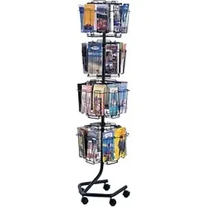 Rotary display features an ideal way to display brochures, pamphlets and other literature. The clean wire look allows for a full-front view of literature. Rotary display includes 32 compartments that measure 4-1/2" wide x 1-3/8" deep to handle large display brochures, pamphlets and other literature. Includes four viewing levels that rotate independently for easy identification and selection. Sets up fast and easy without tools for quick display. Design is ideal for trade shows. Welded wire construction with a charcoal powder-coat finish delivers durability. Base has five dual-wheel casters (two locking).