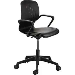 Shell Desk Chair offers intuitive adjustments and a sleek design that fits into any space. Contoured plastic back delivers lumbar support. Seat naturally flexes to fit you comfortably and adjusts in height from 17" to 20". Black vinyl on the seat and arms provides another layer of comfort. The vinyl is also easy to clean. Holes in the back allow breathability. Casters on sturdy, five-star nylon base and 360-degree swivel capabilities make mobility easy.