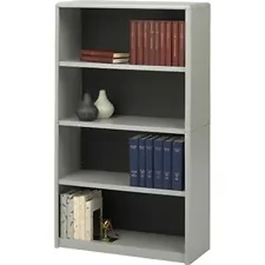 Four-shelf bookcase features a strong steel exterior, shelf construction, and solid fiberboard back. Plastic, snap-in radius corners make assembly easy and add to the overall strength. Shelves, except the bottom one, adjust at 1" increments during assembly. Generous 12" deep steel shelves accommodate three-ring binders and large publications. Each shelf accommodates approximately 70 lb. evenly distributed.