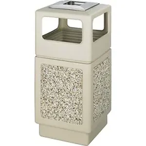 Indoor/outdoor receptacle with ash urn blends well with any environment. The striking, molded-in stone aggregate will add beauty to your first impression areas. The telescoping base hides bag and offers an attractive design with recessed bottom. Four square, side openings offer wide areas for trash disposal. Receptacle is molded from high-density polyethylene with built-in UV inhibitors. The ashtray recessed in the top is made of stainless steel. Each opening measures 9-1/2" wide x 6" high. Receptacle holds up to 38 gallons and uses standard 32" x 44" trash bags. Design is easily adaptable for anchoring or weighting devices.