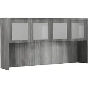 Marketing Information:Aberdeen Series 72" hutch with glass doors has textured glass to highlight the contents but still provide privacy. The glass is tempered for safety and durability, and has four self closing doors. Back panel features two cable grommets. 21 1/2" clearance between work surface and bottom of shelf. Also accepts optional fabric tack panel and task light.