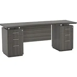 Credenza belongs to the Safco Sterling Laminate Collection with a bold design that is crafted with a contemporary decor in mind. Rich finish and distinctive curves showcase the beauty of this laminate line. Handcrafted, 1-5/8" thick top with knife-edge profile blends harmoniously with distinctive curving worksurface. Chrome stand-offs create a floating top look on the desk and match the chrome drawer pulls on both pedestals. Modesty panel offers stylish privacy. Each pedestal offers two file drawers for letter-size and legal-size files.