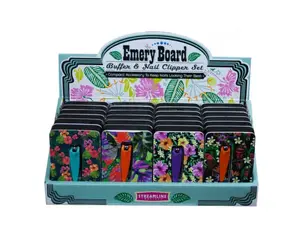 The buffer features a textured floral design on the front for effective filing, while the smooth sides are perfect for buffing. With 24 sets in each countertop display, customers can enjoy a variety of floral designs and colors of nail clippers.