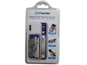 The wallet features a durable grip ring that acts as both a stand and a handle for improved control when using your device. Measuring approximately 3.75" x 2.25" x 0.1", it slips easily into your pocket and adheres securely to the back of your phone or case. Please note that the adhesive may not stick well to glass surfaces.