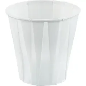 Paper cups are treated, pleated and lightweight. They are ideal for dispensing medications and serving outpatients. Capacity for each is 3.5 oz. Paper cups are made with at least 80 percent renewable resources. They meet ASTM D6868 standard for compostability and are compostable in a commercial compost facility.