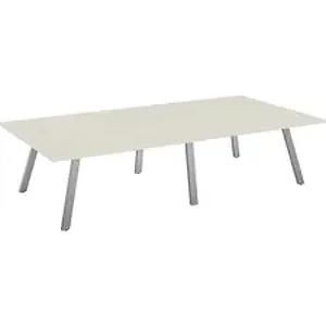 Conference table features an attractive, modern design to add a high level of sophistication to any space. It bridges the gap between traditional work spaces and a new generation of workers to allow them to work in a private setting, collaborate in groups, or connect in informal gathering areas. Dual-pitched legs provide horizontal and lateral stability resulting in a highly sturdy table. Integrated wire management allows cords to pass through the leg to keep them organized without messy clutter. High-pressure, crisp linen laminate offers lasting durability to maintain its sleek style for years to come.