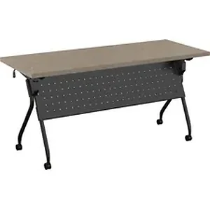 Stylish, lightweight and easy to use, the Transform-2 Flip and Nest Table provides a versatile solution to any training room and classroom environment. Contemporary base offers straight-on nesting in flip-top application that saves room in tight spaces. Each additional table takes up to 7-1/2" in the flipped position. Its lightweight material, casters and one-handed activation allow anyone to flip and move tables with ease. Flip latch allows one-handed activation on both sides. Perforated steel, modesty panel extends 14" below the tabletop and is an integral part of the base, providing privacy and an elegant look at the same time. Continuous, heavy-duty beam prevents top from sagging. Stretcher bar spans between the legs and provides additional stability. Tabletop features high-pressure, patterned laminate in Evening Tigris. Cord management is easy with the J-shape wire manager and table-leg wire channel. Locking, 2-1/4" dual-wheel black casters on the black base hold up to 112 lb.