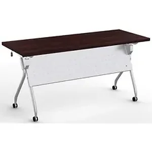 Stylish, lightweight and easy to use, the Transform-2 Flip and Nest Table provides a versatile solution to any training room and classroom environment. Contemporary base offers straight-on nesting in flip-top application that saves room in tight spaces. Each additional table takes up to 7-1/2" in the flipped position. Its lightweight material, casters and one-handed activation allow anyone to flip and move tables with ease. Flip latch allows one-handed activation on both sides. Perforated steel, modesty panel extends 14" below the tabletop and is an integral part of the base, providing privacy and an elegant look at the same time. Continuous, heavy-duty beam prevents top from sagging. Stretcher bar spans between the legs and provides additional stability. Tabletop features high-pressure, patterned laminate in Espresso. Cord management is easy with the J-shape wire manager and table-leg wire channel. Locking, 2-1/4" dual-wheel black casters on the silver base hold up to 112 lb.