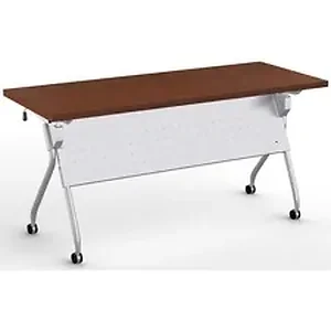 Stylish, lightweight and easy to use, the Transform-2 Flip and Nest Table provides a versatile solution to any training room and classroom environment. Contemporary base offers straight-on nesting in flip-top application that saves room in tight spaces. Each additional table takes up to 7-1/2" in the flipped position. Its lightweight material, casters and one-handed activation allow anyone to flip and move tables with ease. Flip latch allows one-handed activation on both sides. Perforated steel, modesty panel extends 14" below the tabletop and is an integral part of the base, providing privacy and an elegant look at the same time. Continuous, heavy-duty beam prevents top from sagging. Stretcher bar spans between the legs and provides additional stability. Tabletop features high-pressure, patterned laminate in Mahogany. Cord management is easy with the J-shape wire manager and table-leg wire channel. Locking, 2-1/4" dual-wheel black casters on the silver base hold up to 112 lb.