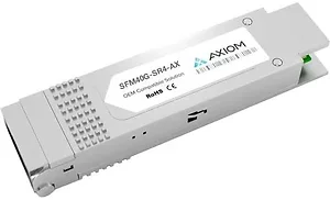 Axiom QSFP Plus transceiver modules are 100 percent compatible in all OEM applications They are preconfigured with an application specific code to meet the requirement set forth by the router and switch OEMs Axiom compatible transceivers perform fit and function identically when compared to Original transceivers Axiom brand transceivers also function with other brands within the same network SpecificationsMode Multimode Fiber Model QSFP40GSR4AXDatarate 40GBASESR4 Formfactor QSFP plusConnector MPO Wavelength 850nmDistance 100m on OM3 MMF 150m on OM4 MMFWeight 022 lbs SKU SYBA37011