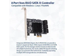 This 8-Port SATA III to PCIe 3.0 x1 adapter card allows you to connect multiple SATA devices to your PC efficiently. It features a low-profile bracket, making it suitable for compact builds and providing seamless integration.