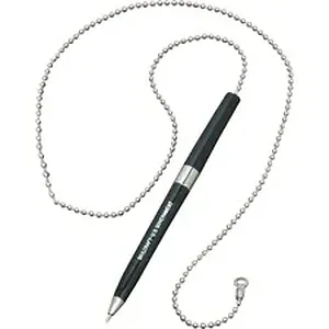 Ballpoint pen with a chain is excellent for public areas where a pen is required. Barrel is stamped with "U.S. Government" for clear identification. Pen top includes a 24" steel chain that attaches to a table or desk to prevent loss. Pen is not retractable and is nonrefillable.