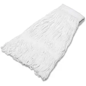 Finishing mop with looped ends is made with a 40 percent rayon and 60 percent polyester blend yarn to effectively spread floor finishes. Four-ply mop features pre-shrunk tail bands and a 5-1/2" mesh headband that allows mophead to be laundered.