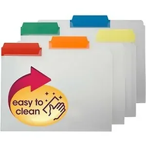 Heavy-duty, poly file folders resist tears, repel moisture and are easy to clean. Super-durable poly is acid-free. Clear front provides easy content identification, and colored tabs make efficient filing simple. 1/3-cut tabs are in assorted positions. Tab colors include blue, green, orange, red and yellow. File folders include blank self-adhesive labels.
