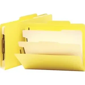 Classification folders make ideal project files because they allow you to create subdivisions of material within one folder. Fasteners on the front and back panels and the dividers create separate filing surfaces. Reinforced self tab is 1/2" high and 2/5-cut right of center. Each 14 point folder expands 2" and offers two 2" prong B-style fasteners in positions 1 and 3. Dividers are made of 18 point manila stock and feature 3/8" high tabs (1/3 cut) and 1" twin prong fasteners on both sides. Divider is fully taped to the gusset.