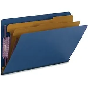 Classification folders offer two-prong fasteners on front and back panels and dividers to six separate filing surfaces within each folder. Gusset allows 2" expansion. Folders are made with 25 point, colored Pressboard stock. Folders have straight-cut tabs and hold legal-size documents. Dividers have 1/3-cut tabs and are made with 17 point kraft stock.