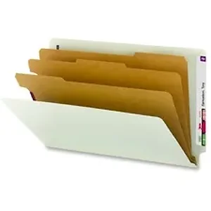 Create files within files. Sturdy dividers with fasteners on both sides allow storing information under several subdivisions in each folder. Dividers have 1/3-cut tabs that are 3/8" high for identifying subdivisions. Folders are ideal for legal-size project, personnel, real estate, accounting and banking files. They have 1/2" wide end tabs that are straight-cut, 3" expansion, rounded top corners, and 2" prong, K-style fasteners in positions No. 1 and 3. Dividers have a 1" twin-prong fastener and are fully taped to the gusset. Dividers are made of 17 point kraft stock. Folders are made of 25 point Pressboard stock with a high percentage of recycled material.