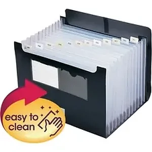Expanding file features an extra-long flap that folds down to create a sturdy base. Pockets expand on both top and bottom for greater storage than standard expanding files. Each pocket expands to a full 7/8". Two clear pockets on front have index card inserts for easy labeling. Expanding file is made of super-durable, water-resistant and tear-resistant polypropylene that is easy to clean. File includes 12 clear indexed dividers, colored tab inserts printed with alphabetical and monthly headings, and a hook-and-loop closure.