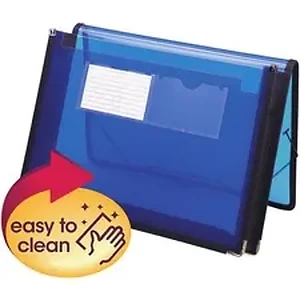 Expanding wallet features heavy-duty polypropylene that resists tearing, repels moisture and is easy to clean. Four-sided carrier holds letter-size sheets and features sewn fabric trim, heavy-duty black cloth gusset, protective cover flap and elastic cord. Expanding wallet holds up to 200 letter-size sheets with a 2-1/4" expansion. Two clear pockets on front are designed for business, title or index cards.